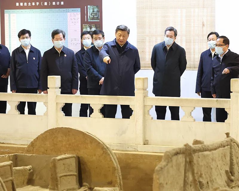 28日下午,習(xí)近平考察了位于安陽市西北郊洹河南北兩岸的殷墟遺址。殷墟是我國歷史上第一個(gè)文獻(xiàn)可考、為考古發(fā)掘所證實(shí)的商代晚期都城遺址。習(xí)近平步入殷墟博物館,仔細(xì)觀摩青銅器、玉器、甲骨文等出土文物。隨后,習(xí)近平來到車馬坑展廳,察看商代畜力車實(shí)物標(biāo)本和道路遺跡。他指出,殷墟出土的甲骨文為我們保存3000年前的文字,把中國信史向上推進(jìn)了約1000年。殷墟我向往已久,這次來是想更深地學(xué)習(xí)理解中華文明,古為今用,為更好建設(shè)中華民族現(xiàn)代文明提供借鑒。中國的漢文字非常了不起,中華民族的形成和發(fā)展離不開漢文字的維系。在這方面,考古事業(yè)居功至偉。考古工作要繼續(xù)重視和加強(qiáng),繼續(xù)深化中華文明探源工程。中華文明源遠(yuǎn)流長,從未中斷,塑造了我們偉大的民族,這個(gè)民族還會偉大下去的。要通過文物發(fā)掘、研究保護(hù)工作,更好地傳承優(yōu)秀傳統(tǒng)文化。習(xí)近平強(qiáng)調(diào),中華優(yōu)秀傳統(tǒng)文化是我們黨創(chuàng)新理論的“根”,我們推進(jìn)馬克思主義中國化時(shí)代化的根本途徑是“兩個(gè)結(jié)合”。我們要堅(jiān)定文化自信,增強(qiáng)做中國人的自信心和自豪感。