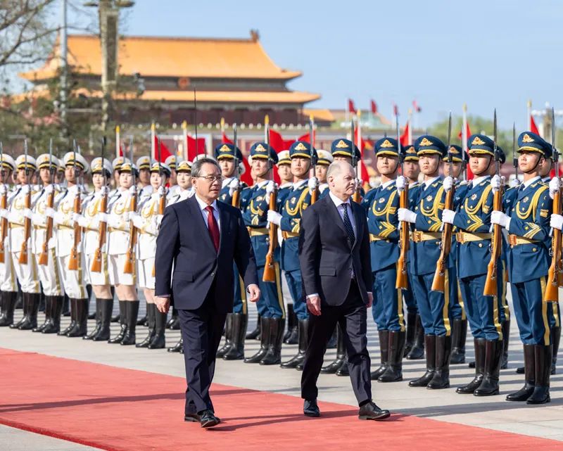 會談前,李強(qiáng)在人民大會堂東門外廣場為朔爾茨舉行歡迎儀式。
