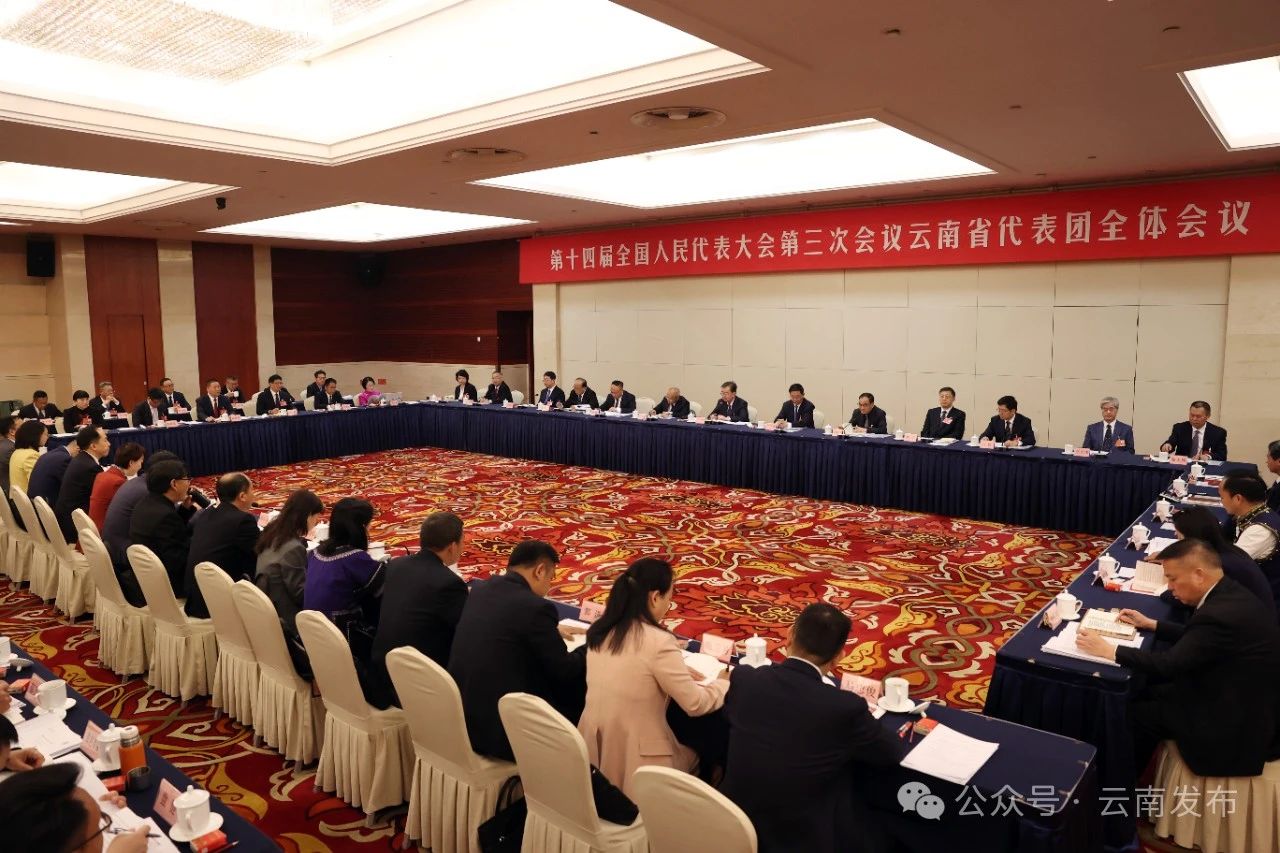 3月10日,出席十四屆全國(guó)人大三次會(huì)議的云南省代表團(tuán)舉行全體會(huì)議。