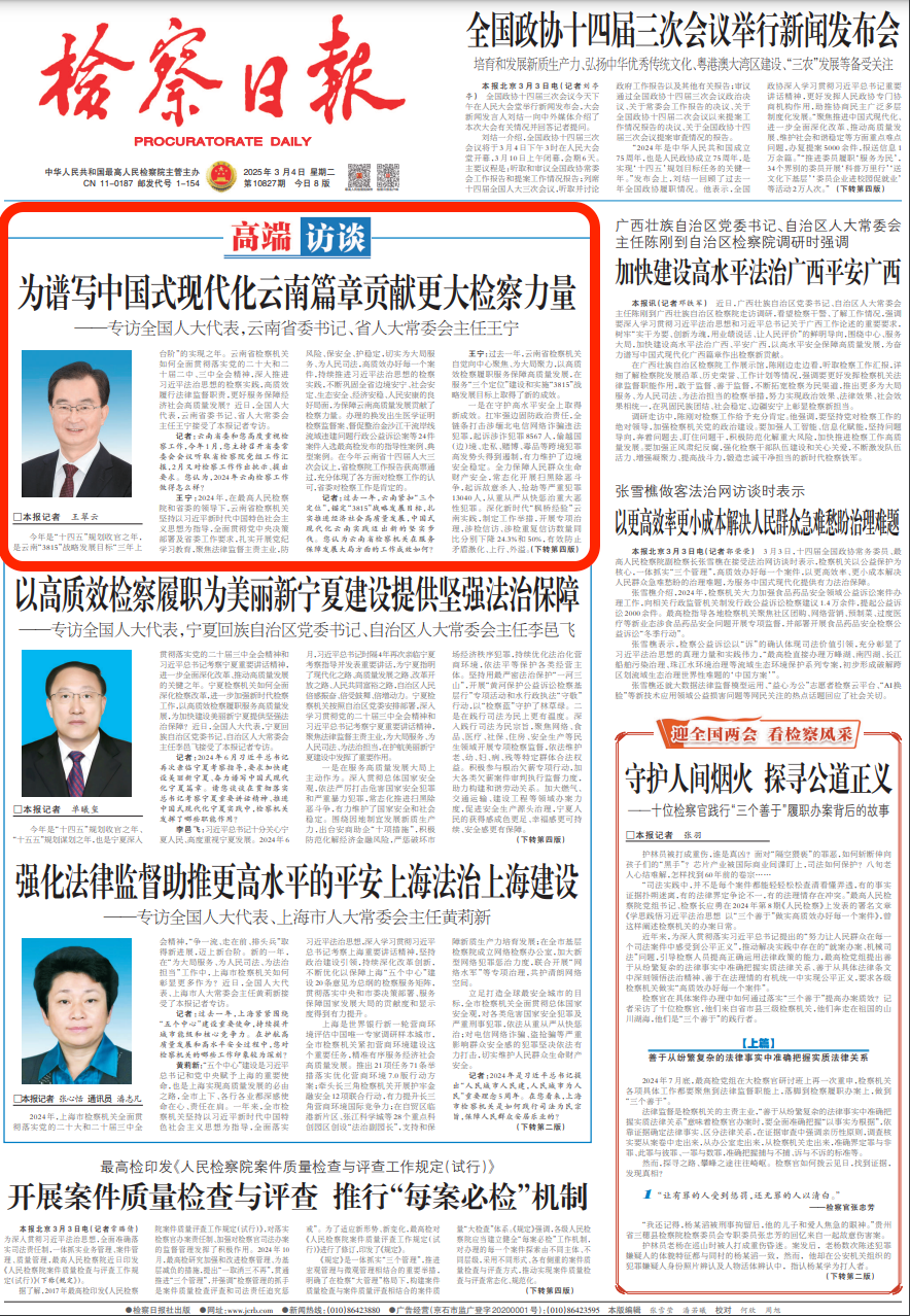 3月4日,《檢察日報》頭版刊發(fā)文章《為譜寫中國式現(xiàn)代化云南篇章貢獻更大檢察力量——專訪全國人大代表,云南省委書記、省人大常委會主任王寧》。