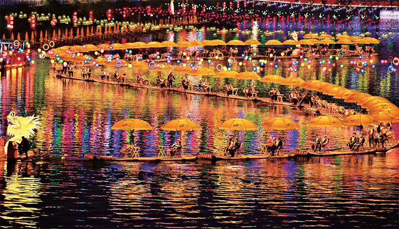蛇年春節(jié),全國(guó)各地張燈結(jié)彩,人們參加各種喜慶活動(dòng),紅紅火火迎新春。圖為2025年1月21日晚,游客在湖北省宣恩縣貢水河中乘坐竹筏賞夜景。新華社發(fā) 宋文/攝?