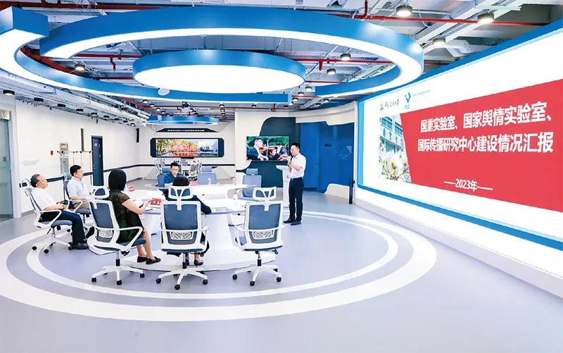 圖為2023年6月1日,教育部黨組第一巡視組在中國傳媒大學(xué)調(diào)研教育部首批試點(diǎn)建設(shè)的9家哲學(xué)社會科學(xué)重點(diǎn)實(shí)驗(yàn)室之一——國家輿情實(shí)驗(yàn)室。 教育部供圖