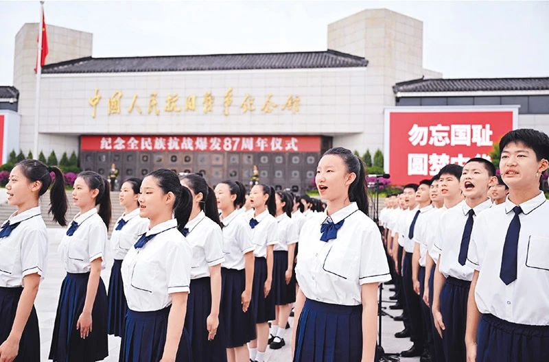 1937年7月7日,日本侵略軍悍然發(fā)動盧溝橋事變(七七事變),當?shù)刂袊v軍奮起抵抗,全民族抗戰(zhàn)由此爆發(fā)。圖為2024年7月7日,首都學(xué)生代表參加在北京中國人民抗日戰(zhàn)爭紀念館舉行的紀念全民族抗戰(zhàn)爆發(fā)87周年儀式。 新華社記者 李響/攝