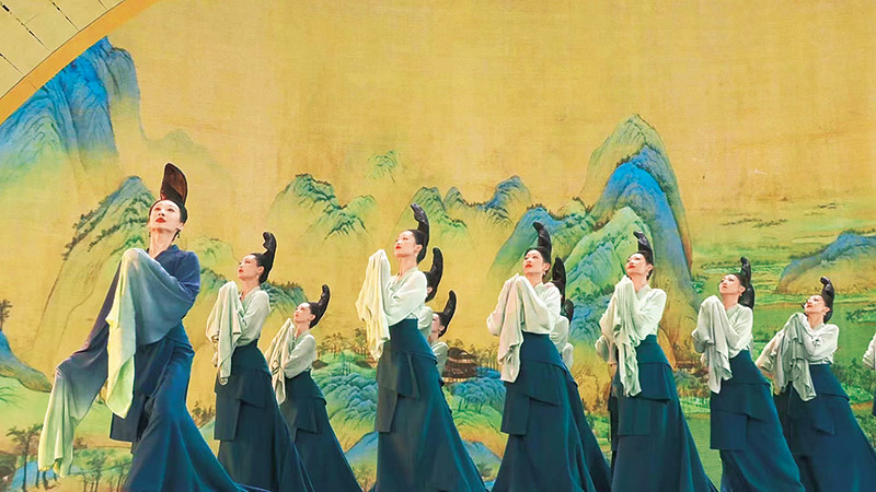 圖為圍繞傳世名作《千里江山圖》創(chuàng)排的舞蹈詩(shī)劇《只此青綠》亮相2022年中央廣播電視總臺(tái)春節(jié)聯(lián)歡晚會(huì)(視頻截圖)。中央廣播電視總臺(tái)供圖