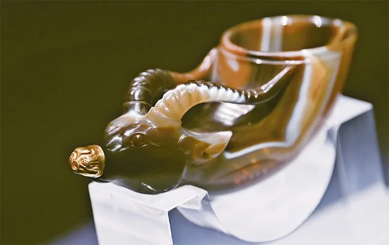 鑲金獸首瑪瑙杯的造型,與起源于古希臘的酒具“來(lái)通”相似,“來(lái)通”曾廣泛流行于中亞、西亞地區(qū),沿著絲綢之路不斷東傳進(jìn)入中國(guó),讓我們見(jiàn)證兩千余年來(lái)中華文明與絲綢之路沿線(xiàn)各國(guó)經(jīng)濟(jì)、文化交流的悠久歷史。圖為在陜西歷史博物館展出的鑲金獸首瑪瑙杯。新華社記者 李一博/攝