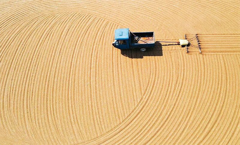 6月,正值小麥集中收獲時節(jié),各地農(nóng)民搶抓晴好天氣忙著收割、晾曬小麥,確保小麥顆粒歸倉。圖為2023年6月9日,在江蘇省如皋市糧食儲備有限公司曬糧場上,工作人員用機械翻曬入庫的小麥。 新華社發(fā) 吳樹建/攝