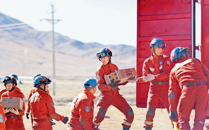新時代以來,廣大青年在搶險救災(zāi)前線沖鋒陷陣,在黨和人民最需要的時刻沖得出來、頂?shù)蒙先ィ宫F(xiàn)出自信自強、剛健有為的精神風(fēng)貌。2025年1月7日,西藏自治區(qū)日喀則市定日縣發(fā)生6.8級地震。圖為1月9日西藏自治區(qū)森林消防總隊派出的救援人員在地震重災(zāi)區(qū)日喀則市拉孜縣拉孜鎮(zhèn)措布村卸載救災(zāi)物資。新華社記者 姜帆/攝
