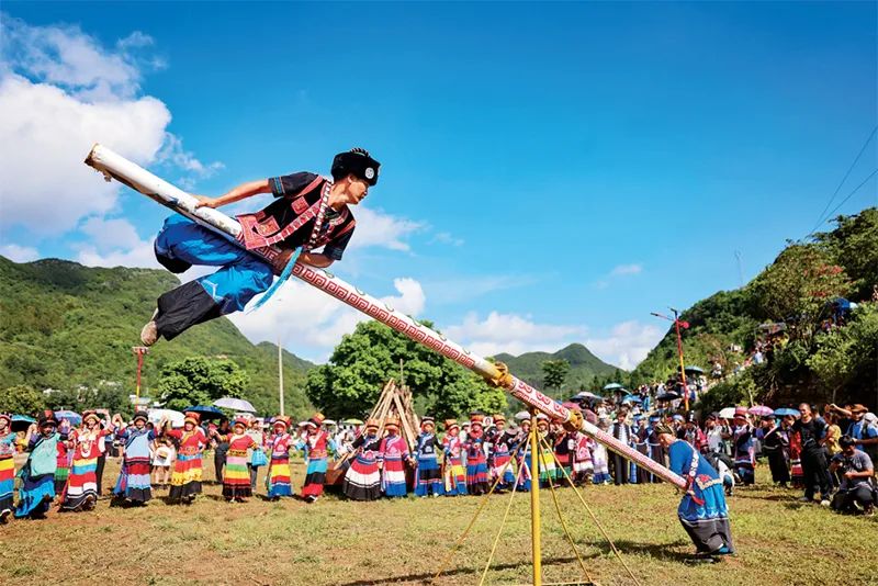 2023年8月10日是彝族傳統(tǒng)節(jié)日火把節(jié),廣西百色市隆林各族自治縣德峨鎮(zhèn)阿搞屯的村民在取火祭火、祭送布谷鳥、打磨秋、抹黑臉、篝火晚會等民族特色活動中歡慶節(jié)日、傳遞祝福。圖為村民展示彝族傳統(tǒng)習俗——打磨秋。 新華社記者 胡星宇/攝