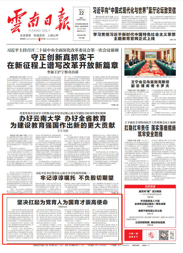 賡續(xù)百年榮光,再啟奮斗新程。偉大事業(yè)、偉大夢(mèng)想呼喚更堅(jiān)實(shí)的優(yōu)秀人才支撐。讓我們更加緊密地團(tuán)結(jié)在以習(xí)近平同志為核心的黨中央周圍,牢記習(xí)近平總書記的殷殷囑托,在新征程上矢志為黨育人、為國(guó)育才,為建設(shè)教育強(qiáng)國(guó)貢獻(xiàn)更大力量,奮力譜寫好中國(guó)式現(xiàn)代化的云南篇章。