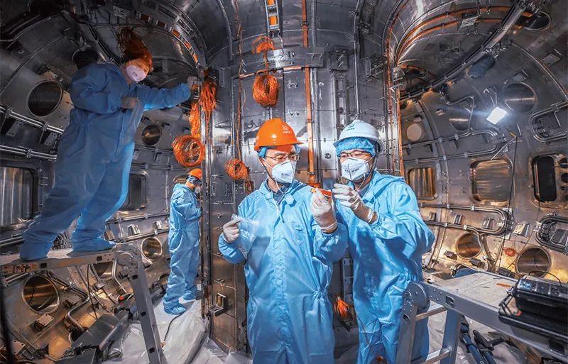 2022年10月,新一代“人造太陽”等離子體電流突破100萬安培(1兆安),創(chuàng)造了中國可控核聚變裝置運(yùn)行新紀(jì)錄。圖為2022年4月,中核集團(tuán)科技人員在新一代“人造太陽”真空室內(nèi)解決安裝調(diào)試過程中的技術(shù)難點。 中核集團(tuán)供圖 王雨萌/攝