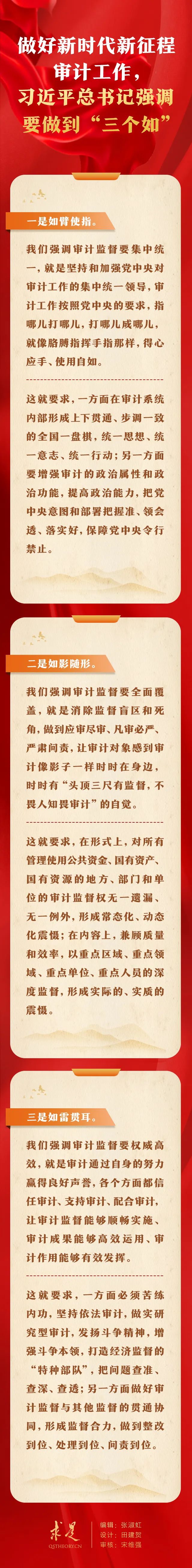 11月1日出版的第21期《求是》雜志刊發(fā)習(xí)近平總書記重要文章《在二十屆中央審計(jì)委員會第一次會議上的講話》。在這篇重要文章中,習(xí)近平總書記指出:“做好新時(shí)代新征程審計(jì)工作,總的要求是在構(gòu)建集中統(tǒng)一、全面覆蓋、權(quán)威高效的審計(jì)監(jiān)督體系,更好發(fā)揮審計(jì)監(jiān)督作用上聚焦發(fā)力,具體要做到‘三個(gè)如’?!?