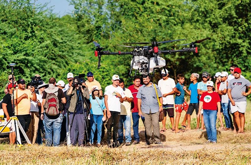 圖為2024年2月2日,在巴西阿波迪舉行的中巴農(nóng)業(yè)機(jī)械化合作示范項(xiàng)目啟動(dòng)儀式上,人們觀看一款中國(guó)生產(chǎn)的農(nóng)用無(wú)人機(jī)。新華社記者 王天聰/攝