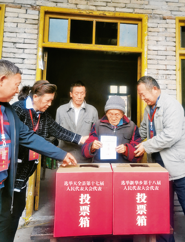 從2021年上半年起,全國縣鄉(xiāng)兩級人大換屆選舉陸續(xù)展開。就在中央人大工作會議結(jié)束后的第二天,四川省雅安市天全縣新華鄉(xiāng)永安村8組的106歲老人李朝蘭,迎來了她人生中的第18次換屆選舉投票——這一天,她依法行使自己的權(quán)利,為產(chǎn)生新一屆縣鄉(xiāng)兩級人大代表投出寶貴一票。圖為李朝蘭老人鄭重投出選票?!∪珖舜蟪N瘯﹫D 楊愛玲/攝