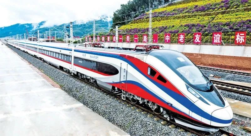 2021年12月3日,中老兩國互利合作的旗艦項目和高質(zhì)量共建“一帶一路”的標(biāo)志性工程——中老鐵路全線通車。圖為“瀾滄號”動車組列車正在駛過中老鐵路磨憨站。 云南日報供圖 陳暢/攝