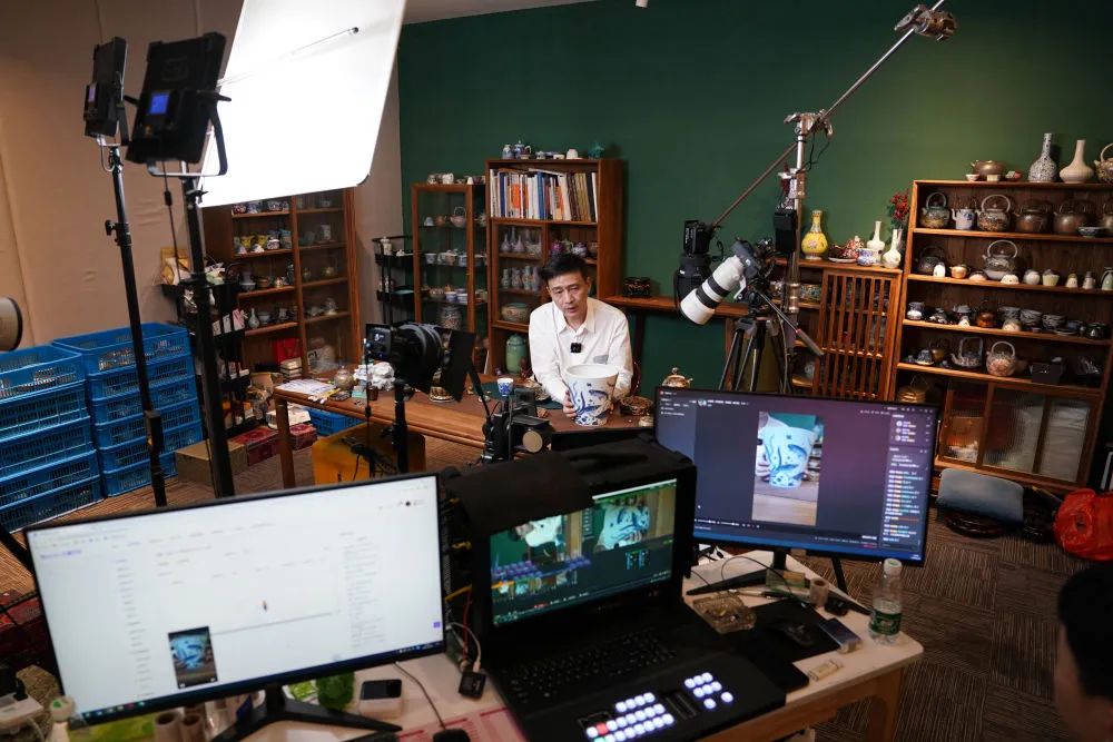 在江西景德鎮(zhèn)陶溪川文創(chuàng)街區(qū)的直播基地里,工作人員通過(guò)網(wǎng)絡(luò)直播推介陶瓷產(chǎn)品(2023年2月22日攝)。新華社記者 周密 攝