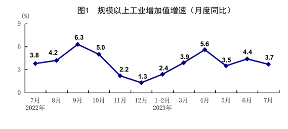7月份,全國規(guī)模以上工業(yè)增加值同比增長3.7%,環(huán)比增長0.01%。分三大門類看,采礦業(yè)增加值同比增長1.3%,制造業(yè)增長3.9%,電力、熱力、燃氣及水生產(chǎn)和供應(yīng)業(yè)增長4.1%。原材料制造業(yè)增加值同比增長8.8%,比上月加快2.0個百分點。分經(jīng)濟類型看,國有控股企業(yè)增加值同比增長3.4%;股份制企業(yè)增長5.0%,外商及港澳臺商投資企業(yè)下降1.8%;私營企業(yè)增長2.5%。分產(chǎn)品看,太陽能電池、新能源汽車產(chǎn)品產(chǎn)量同比分別增長65.1%、24.9%。1-7月份,全國規(guī)模以上工業(yè)增加值同比增長3.8%。7月份,制造業(yè)采購經(jīng)理指數(shù)為49.3%,企業(yè)生產(chǎn)經(jīng)營活動預期指數(shù)為55.1%。