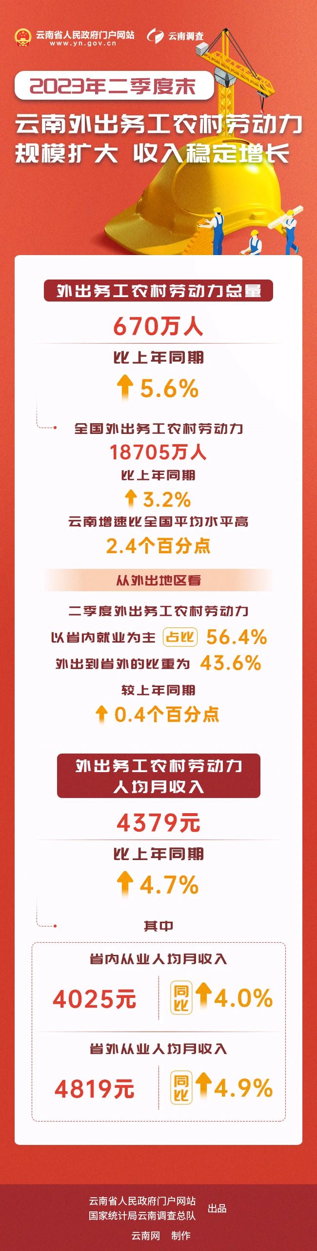 2023年二季度末,云南省外出務(wù)工農(nóng)村勞動(dòng)力人均月收入為4379元,同比增長4.7%。其中,省內(nèi)從業(yè)人均月收入4025元,同比增長4.0%;省外從業(yè)人均月收入4819元,同比增長4.9%。