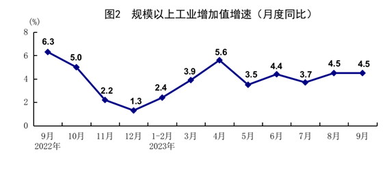 前三季度,全國規(guī)模以上工業(yè)增加值同比增長4.0%,比上半年加快0.2個百分點。分三大門類看,采礦業(yè)增加值同比增長1.7%,制造業(yè)增長4.4%,電力、熱力、燃氣及水生產(chǎn)和供應業(yè)增長3.5%。裝備制造業(yè)增加值增長6.0%,比全部規(guī)模以上工業(yè)快2.0個百分點。分經(jīng)濟類型看,國有控股企業(yè)增加值同比增長4.6%;股份制企業(yè)增長4.8%,外商及港澳臺商投資企業(yè)增長0.5%;私營企業(yè)增長2.3%。分產(chǎn)品看,太陽能電池、充電樁、新能源汽車產(chǎn)量分別增長63.2%、34.2%、26.7%。9月份,規(guī)模以上工業(yè)增加值同比增長4.5%,增速與上月持平,比7月份加快0.8個百分點;環(huán)比增長0.36%。1-8月份,全國規(guī)模以上工業(yè)企業(yè)實現(xiàn)利潤總額同比下降11.7%,降幅比上半年收窄5.1個百分點,其中8月份同比增長17.2%。9月份,制造業(yè)采購經(jīng)理指數(shù)為50.2%,比上月上升0.5個百分點,企業(yè)生產(chǎn)經(jīng)營活動預期指數(shù)為55.5%。