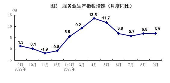 前三季度,服務業(yè)增加值同比增長6.0%。其中,住宿和餐飲業(yè),信息傳輸、軟件和信息技術服務業(yè),租賃和商務服務業(yè),交通運輸、倉儲和郵政業(yè),金融業(yè)增加值分別增長14.4%、12.1%、9.5%、7.5%、7.0%。9月份,服務業(yè)生產(chǎn)指數(shù)同比增長6.9%,比上月加快0.1個百分點,增速連續(xù)2個月回升。其中,住宿和餐飲業(yè),信息傳輸、軟件和信息技術服務業(yè),交通運輸、倉儲和郵政業(yè)生產(chǎn)指數(shù)分別增長17.7%、11.3%、9.3%。1-8月份,全國規(guī)模以上服務業(yè)企業(yè)營業(yè)收入同比增長7.2%。9月份,服務業(yè)商務活動指數(shù)為50.9%,比上月上升0.4個百分點;業(yè)務活動預期指數(shù)為58.1%。其中,水上運輸、郵政、電信廣播電視及衛(wèi)星傳輸服務、互聯(lián)網(wǎng)軟件及信息技術服務、貨幣金融服務等行業(yè)商務活動指數(shù)位于55.0%以上較高景氣區(qū)間。