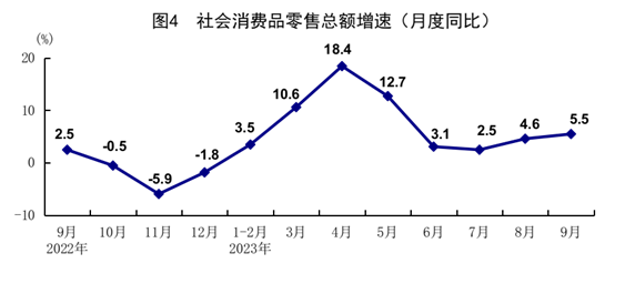 前三季度,社會消費品零售總額342107億元,同比增長6.8%。按經(jīng)營單位所在地分,城鎮(zhèn)消費品零售額296410億元,同比增長6.7%;鄉(xiāng)村消費品零售額45697億元,增長7.4%。按消費類型分,商品零售305002億元,增長5.5%;餐飲收入37105億元,增長18.7%?;旧铑惿唐蜂N售穩(wěn)定增長,限額以上單位服裝鞋帽針紡織品類、糧油食品類商品零售額分別增長10.6%、5.3%。升級類商品銷售較快增長,限額以上單位金銀珠寶類、體育娛樂用品類、化妝品類商品零售額分別增長12.2%、8.3%、6.8%。全國網(wǎng)上零售額108198億元,同比增長11.6%。其中,實物商品網(wǎng)上零售額90435億元,增長8.9%,占社會消費品零售總額的比重為26.4%。9月份,社會消費品零售總額同比增長5.5%,比上月加快0.9個百分點,增速連續(xù)2個月加快;環(huán)比增長0.02%。前三季度,服務零售額同比增長18.9%。