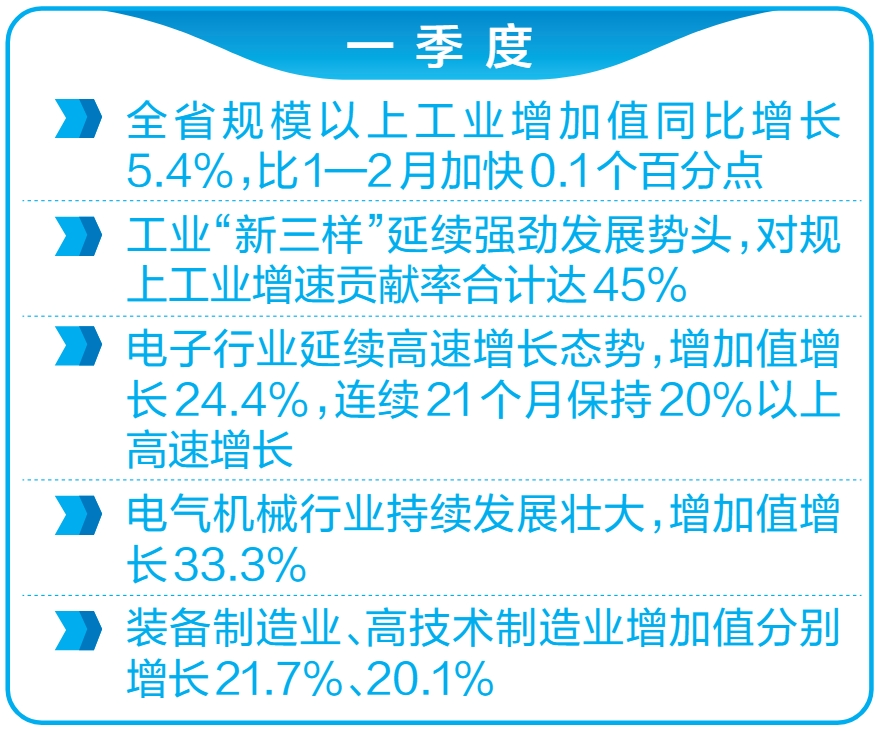 傳統(tǒng)行業(yè)支撐有力,優(yōu)勢(shì)產(chǎn)業(yè)集聚成勢(shì),新興產(chǎn)業(yè)高速增長(zhǎng)。今年以來(lái),我省大抓產(chǎn)業(yè)、主攻工業(yè),緊緊扭住“八個(gè)關(guān)鍵性抓手”,聚力推進(jìn)“四大支撐性工程”,加快構(gòu)建現(xiàn)代化工業(yè)體系,工業(yè)經(jīng)濟(jì)穩(wěn)中有進(jìn),新動(dòng)能加速蓄積。統(tǒng)計(jì)數(shù)據(jù)顯示,一季度,全省規(guī)模以上工業(yè)增加值同比增長(zhǎng)5.4%,比1—2月加快0.1個(gè)百分點(diǎn)。