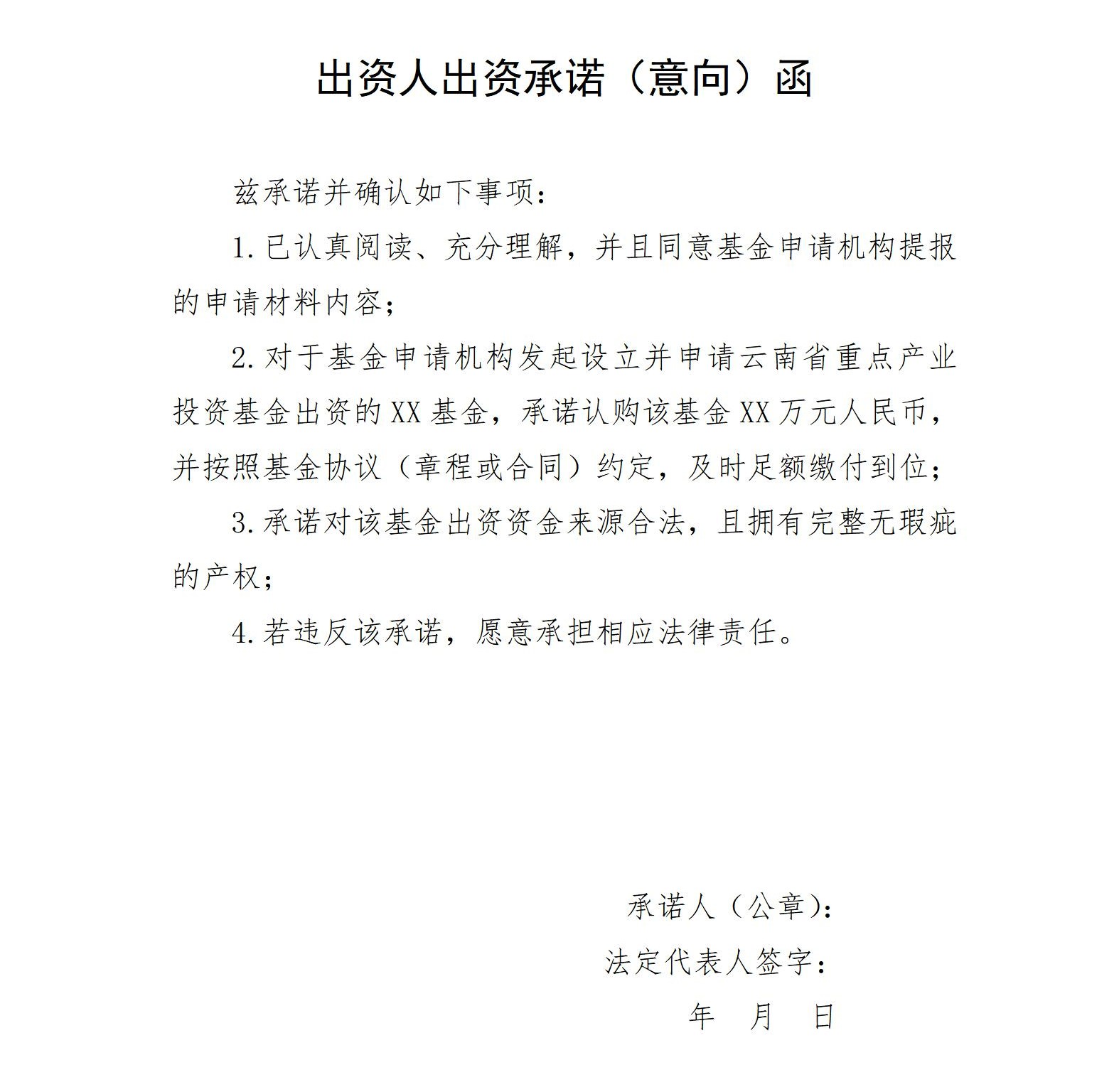 ? ? ??(二)申報(bào)事項(xiàng)。各行業(yè)主管部門(mén)、地方政府按照《產(chǎn)業(yè)基金申報(bào)指南》(見(jiàn)附件)的要求,向云南金控集團(tuán)或其指定的省重點(diǎn)基金管理人提交申報(bào)設(shè)立產(chǎn)業(yè)基金文件,包括產(chǎn)業(yè)基金設(shè)立方案、基金管理人情況、基金章程或協(xié)議草案、出資人出資意向及出資能力證明等相關(guān)材料。