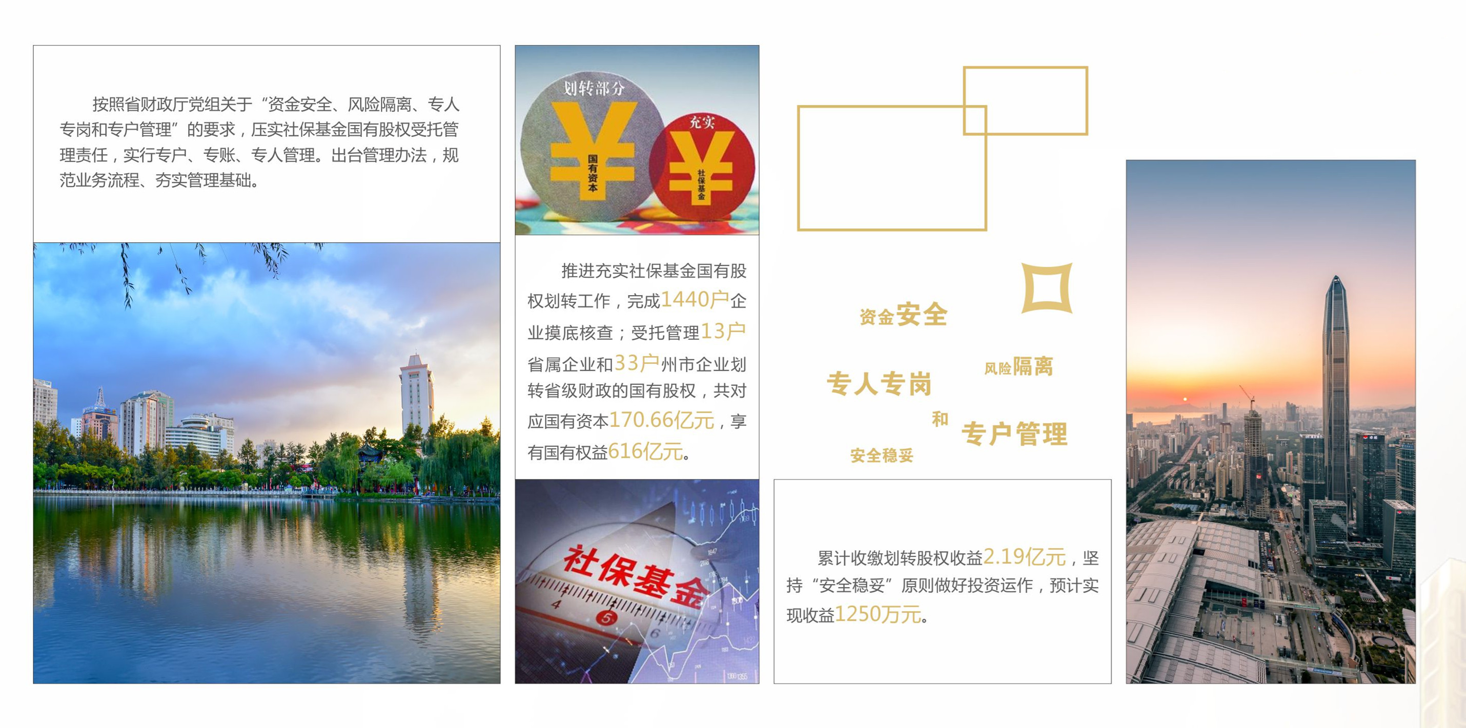 按照省財(cái)政廳黨組“資金安全、風(fēng)險(xiǎn)隔離、專人專崗和專戶管理”的要求,集團(tuán)緊扣職能定位,加強(qiáng)統(tǒng)籌謀劃,單獨(dú)成立社保資產(chǎn)管理中心,壓實(shí)受托管理責(zé)任。聚焦劃轉(zhuǎn)股權(quán)后續(xù)管理,積極構(gòu)建“1+2+4”管理制度體系,規(guī)范業(yè)務(wù)流程、夯實(shí)管理基礎(chǔ)。全國(guó)首家出臺(tái)專戶會(huì)計(jì)核算辦法,嚴(yán)格實(shí)行專戶、專賬、專人管理,確保資金安全。完成1440戶企業(yè)摸底核查,受托管理13戶省屬企業(yè)和33戶州市企業(yè)劃轉(zhuǎn)省級(jí)財(cái)政的國(guó)有股權(quán),共對(duì)應(yīng)國(guó)有資本171億元,享有國(guó)有權(quán)益616億元。累計(jì)收取分紅收益3.16億元,按照“安全穩(wěn)妥、兼顧收益”原則,全部完成投資運(yùn)作,預(yù)計(jì)到期收益3287萬(wàn)元。